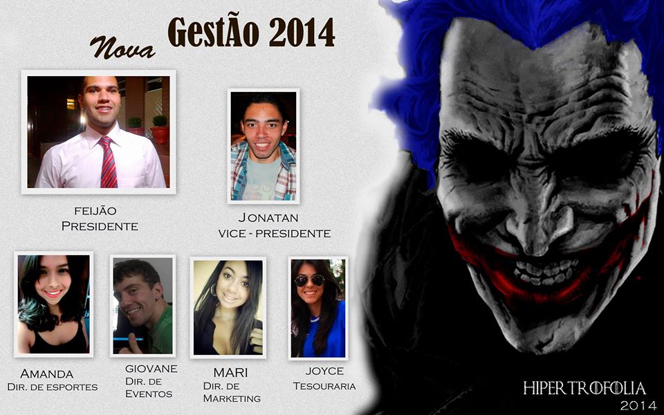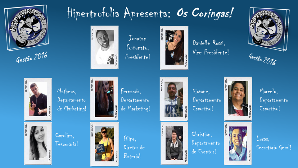 "Carrego o azul e branco no meu peito apaixonado! Nenhuma frase descreve melhor o que é fazer parte dessa atlética! Foram 3 anos de diretoria da Hiper, desde o reinício até à presidência, 3 anos de muito amor, dedicação e alegrias, sem perder uma viagem, um jogos! E depois de tudo isso, sei que vale a pena e faria novamente! Muito obrigado Hipertrofolia!!! Nunca deixem isso acabar!!".